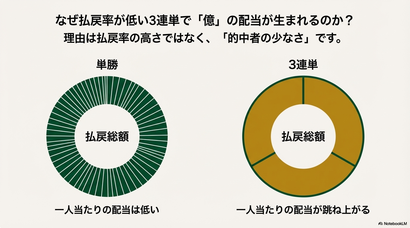 3連単の払い戻しが時に数百万、数千万円という高額になる理由は、払戻率が高いからではありません。その理由は「的中するのが極めて難しい」からです。非常に難解なため的中者がごく少数(あるいは1人)となり、そのレースの3連単の総売上から27.5%を引いた莫大な賞金プール(72.5%分)を、ごく少人数で独占(あるいは山分け)するために、一人当たりの配当が跳ね上がるのです。