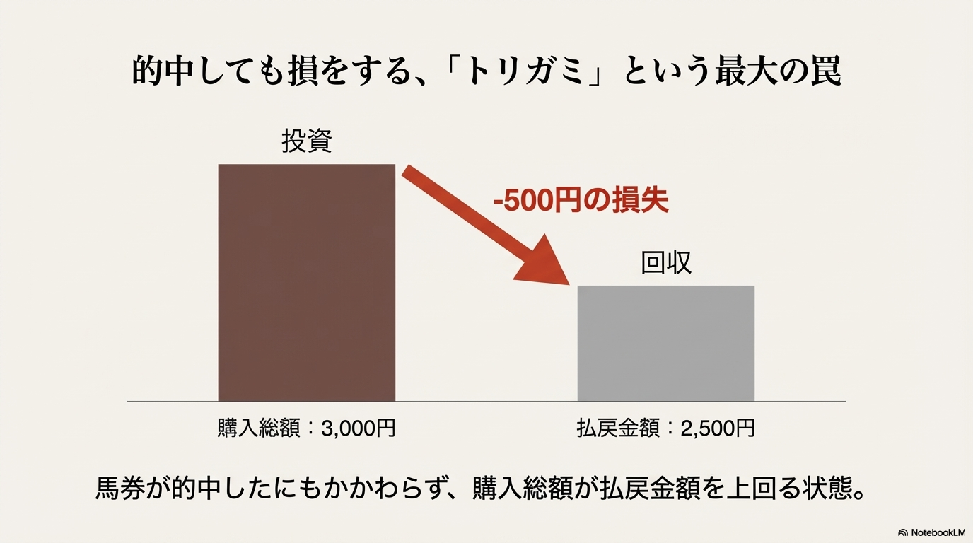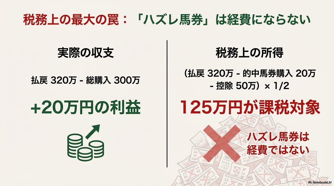 ここで、税務計算における最大の注意点、そして多くの人が誤解しやすい「落とし穴」があります。それは、上記計算式の(B)「その払戻金を得るための的中馬券購入額」の解釈です。