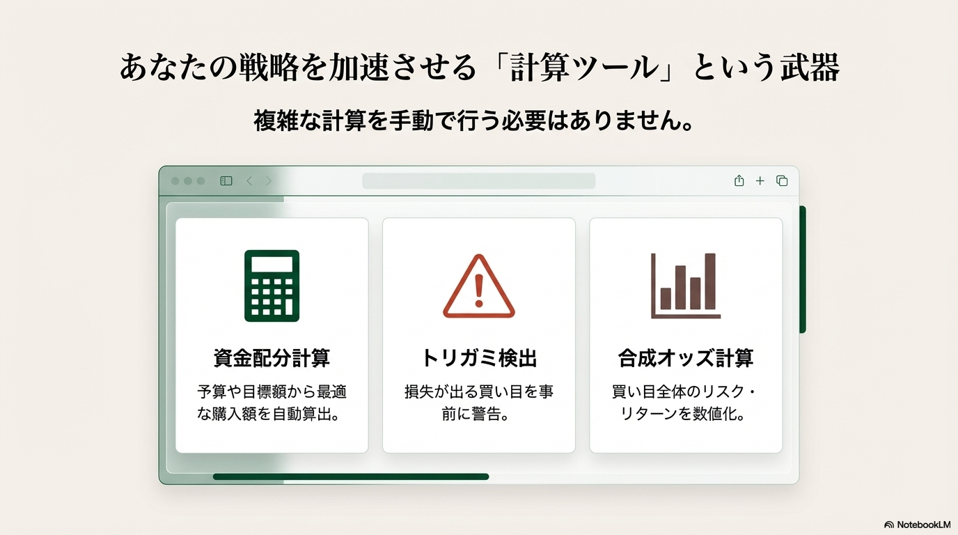 - この複雑な資金配分計算には、手動ではなく無料の「合成オッズ計算ツール」や「計算アプリ」の活用が非常に便利です