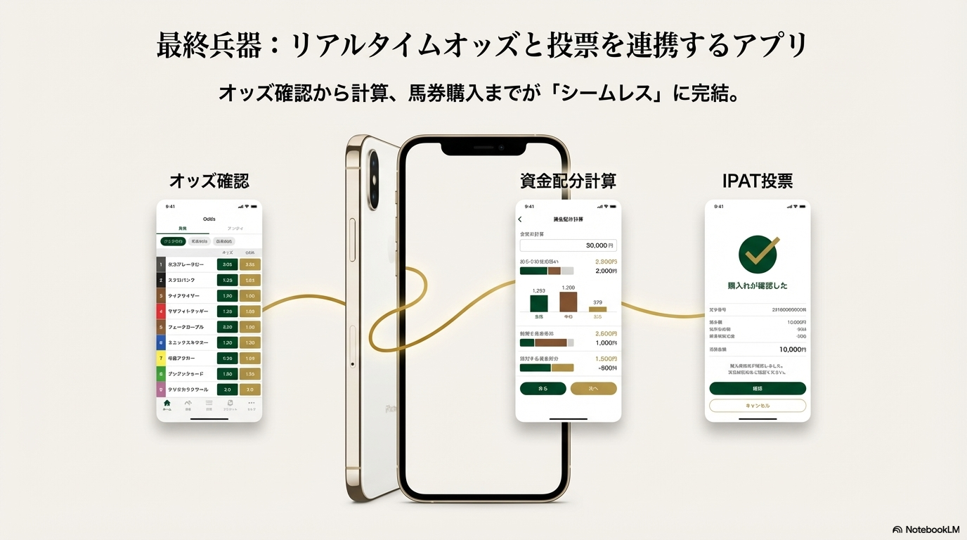- 特に競馬アプリ(netkeibaやJRA-VANなど)は、リアルタイムのオッズ取得から計算、IPAT投票連携までをシームレスに行えます