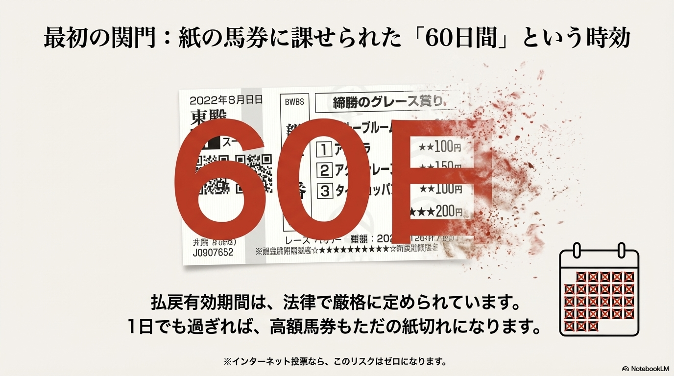 - 【最重要注意点】 紙の的中馬券の払戻有効期限は、法律で厳格に「60日間」と定められています