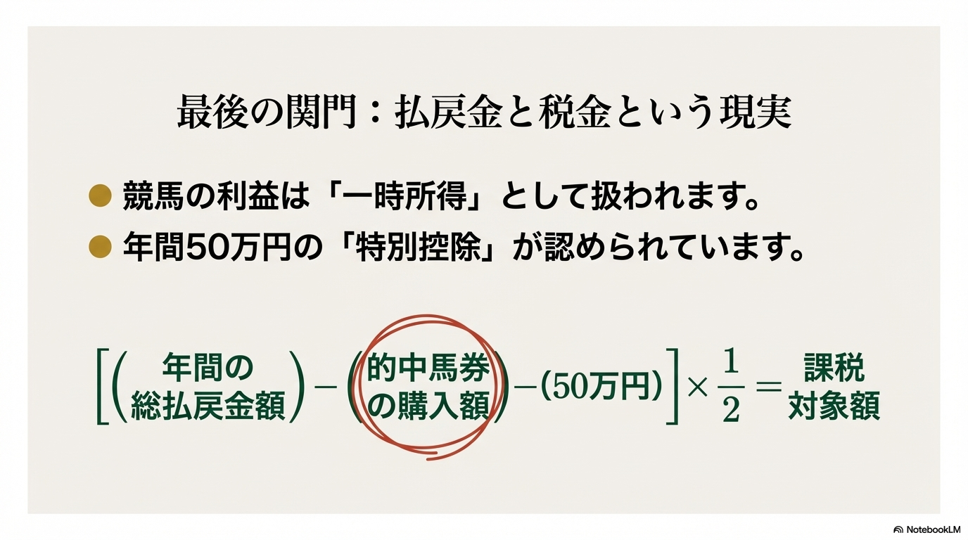 - 【最重要注意点】 競馬で得た利益は、原則として「一時所得」として扱われ、年間の利益が50万円(特別控除額)を超えると課税対象になる可能性があります