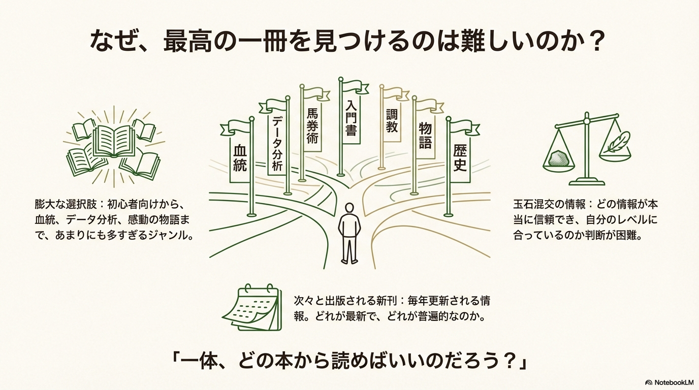 ただ、いざ書店やオンラインストアで探し始めると、その膨大な選択肢を前にして「一体どの本から読めばいいのだろう?」と迷ってしまうことも少なくありません。「競馬の本で人気なのは?」という素朴な疑問から、「競馬の勉強になる本は?」「競馬の血統の本でおすすめの本は?」といった、より具体的な目的意識を持つ方もいらっしゃるでしょう。