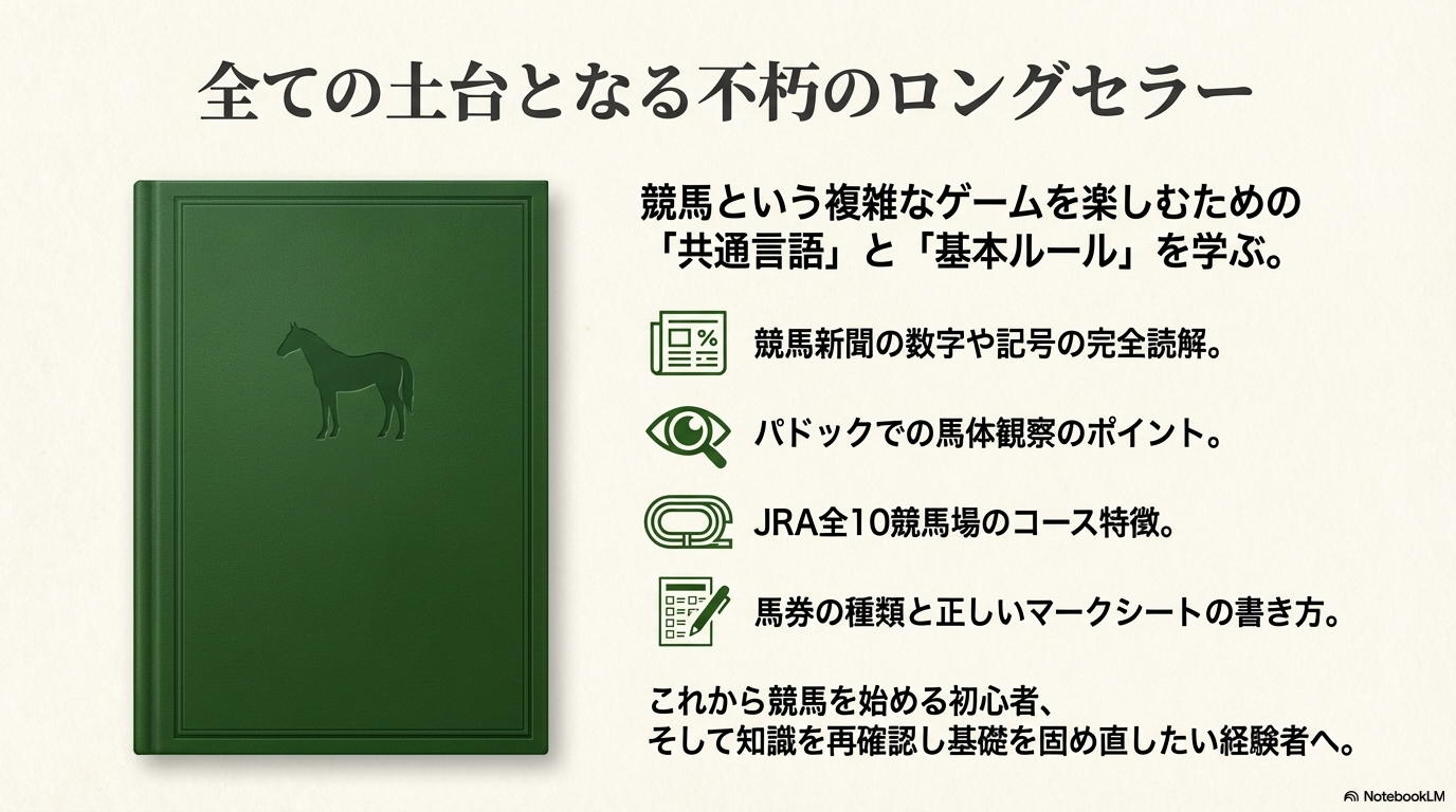 これから競馬を始めようとする人々にとって、これほど頼りになる道しるべはありません。また、ある程度経験を積んだファンにとっても、自分の知識を再確認し、基礎を固め直す上で非常に役立ちます。