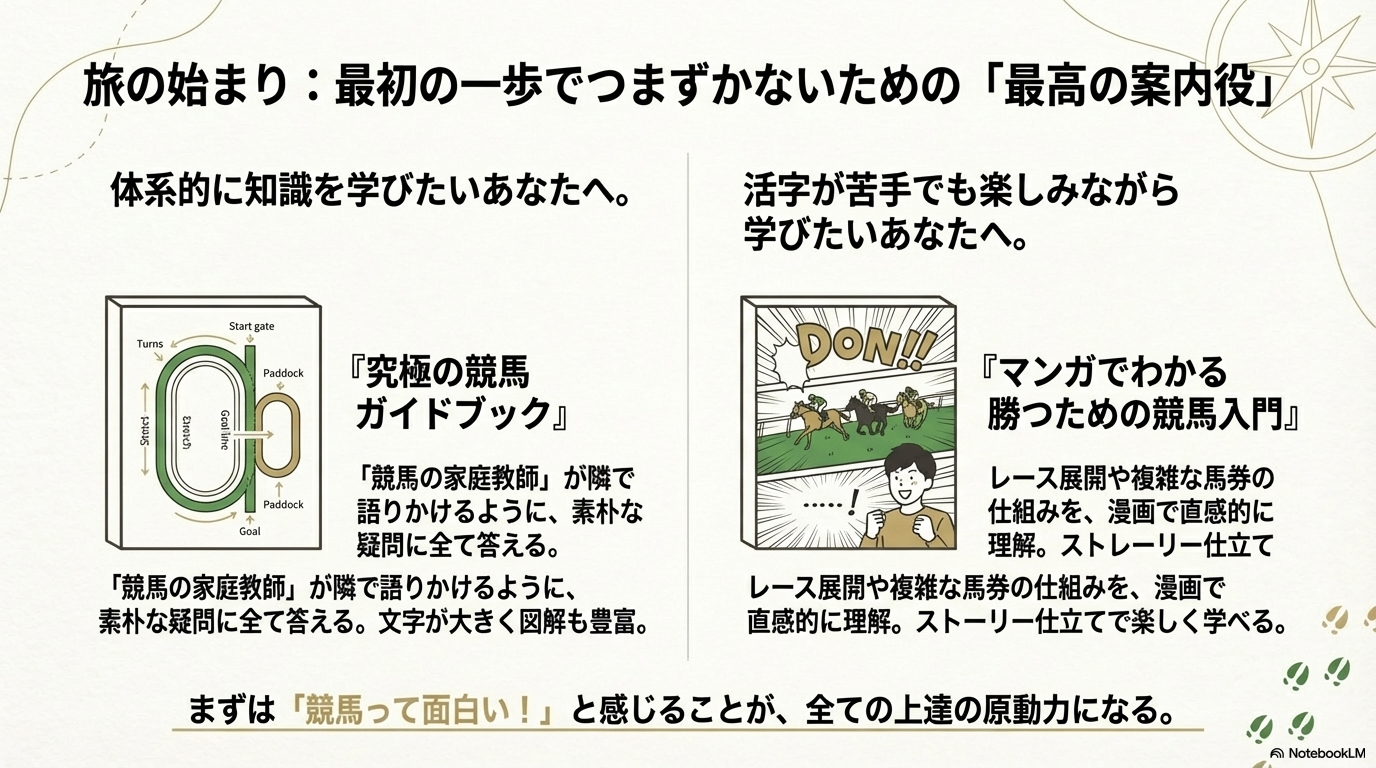もしあなたが競馬を始めたばかりなら、まずは全体像を楽しく学べる入門書(『究極の競馬ガイドブック』や漫画形式の本など)から始めましょう。専門書にいきなり挑戦するのではなく、競馬の「共通言語」を学ぶことが最優先です。 - 【あなたの目的は?】