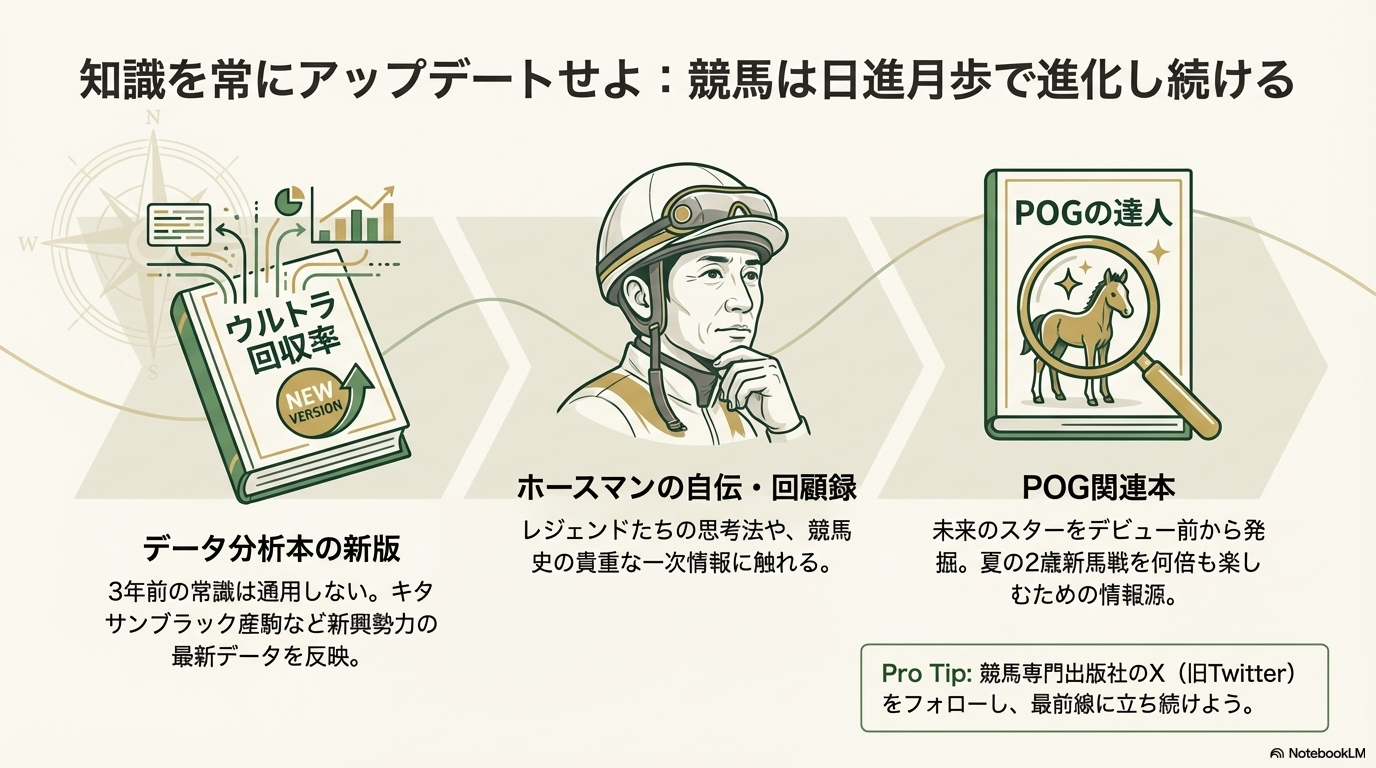 馬券の的中だけでなく、馬と人が織りなすドラマに感動したいなら、騎手や調教師の自伝・ノンフィクションがおすすめです。また、競馬の歴史や過去の名馬の物語を知ることは、現代のレース観戦に新たな奥行きを与えてくれるでしょう。 - 【情報の鮮度を意識していますか?】