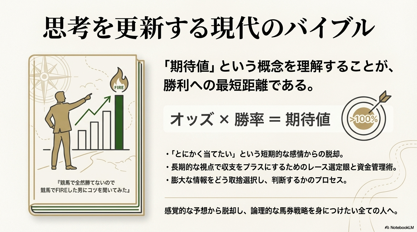 私見ですが、『教科書』で競馬の基本的な仕組みや用語という「基礎体力」を身につけ、その上で『FIREした男にコツを聞いてみた』で勝つための「実践的な戦略」を学ぶ、というステップが非常に効果的だと感じます。どちらも持っていて損のない、現代競馬本の二大巨頭と言えるかもしれません。