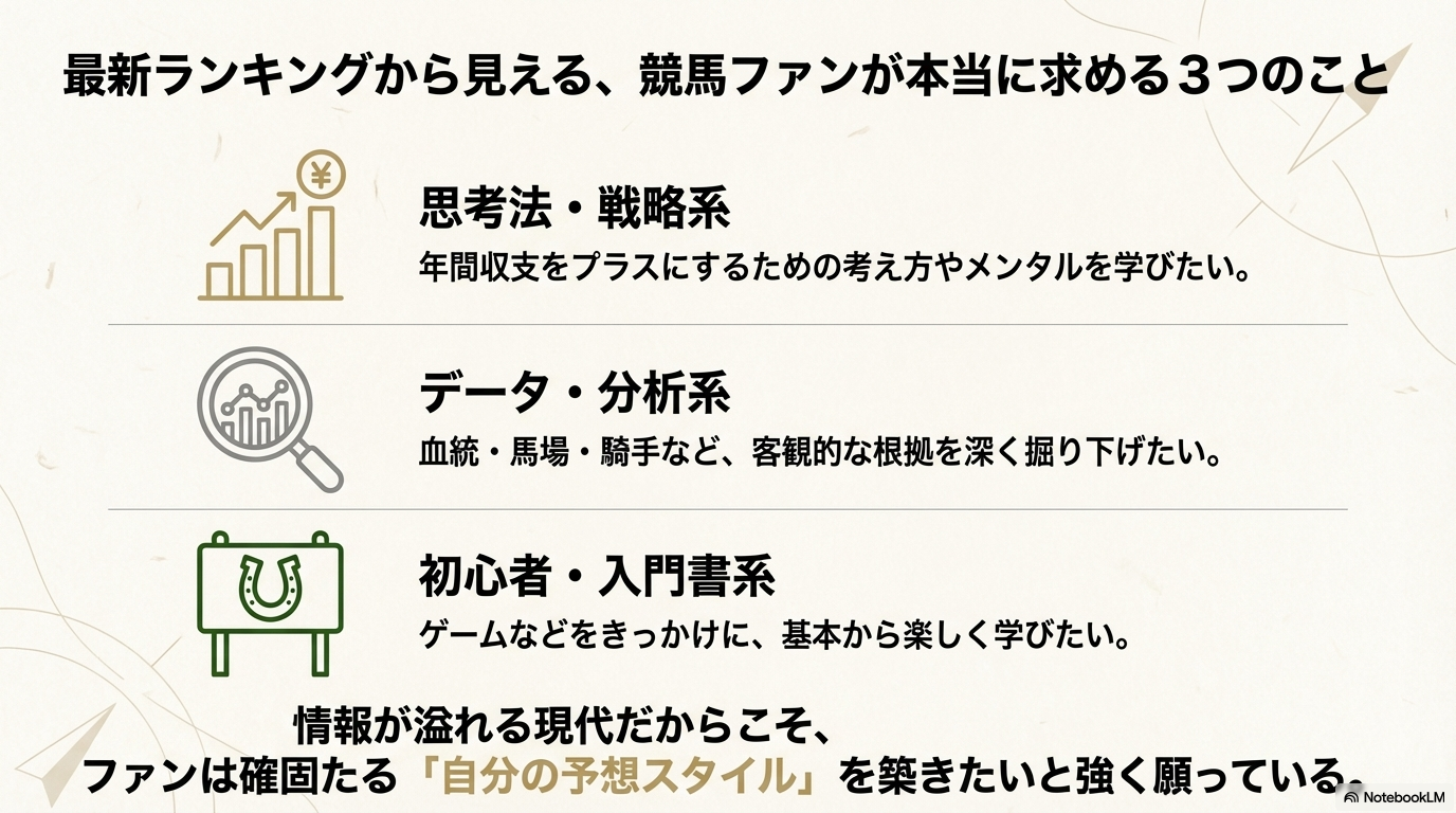 近年の売上ランキングを分析すると、現在の競馬ファンが求める書籍の傾向として、明確な3つのトレンドが見えてきます。これは、多くのファンが自分なりの確固たる予想スタイルを築きたいと強く願っていることの表れかもしれません。