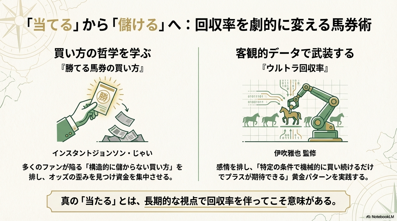 この本は「期待値」という概念を軸にしながらも、その期待値を判断するために不可欠な「レース回顧」の重要性を説いています。つまり、レース結果という「データ」を、次の予想にどう活かすかという具体的なプロセスを重視しているのです。じゃい氏の本が「買い方」の戦略に、『ウルトラ回収率』が「条件」のデータに重きを置くのに対し、本書はレースを分析して「馬の能力」を正しく評価するという、より本質的な作業に焦点を当てています。これらの書籍に書かれた理論を学び、自分なりの「勝ちパターン」を構築していくことこそが、安定したプラス収支への最短ルートとなります。