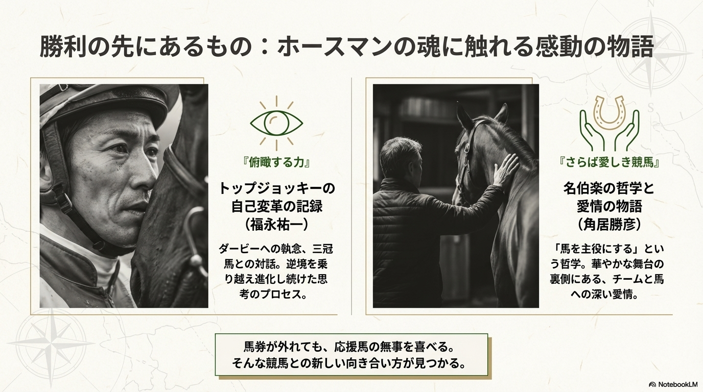 一見、馬券の予想とは無関係に思えるかもしれませんが、トップホースマンたちの思考や哲学、そして彼らが馬に向ける愛情の深さを知ることは、その厩舎や騎手の勝負気配を読み解く上で、意外なヒントを与えてくれることも少なくありません。ここでは、あなたの心を揺さぶる、珠玉のノンフィクションや自伝をご紹介します。