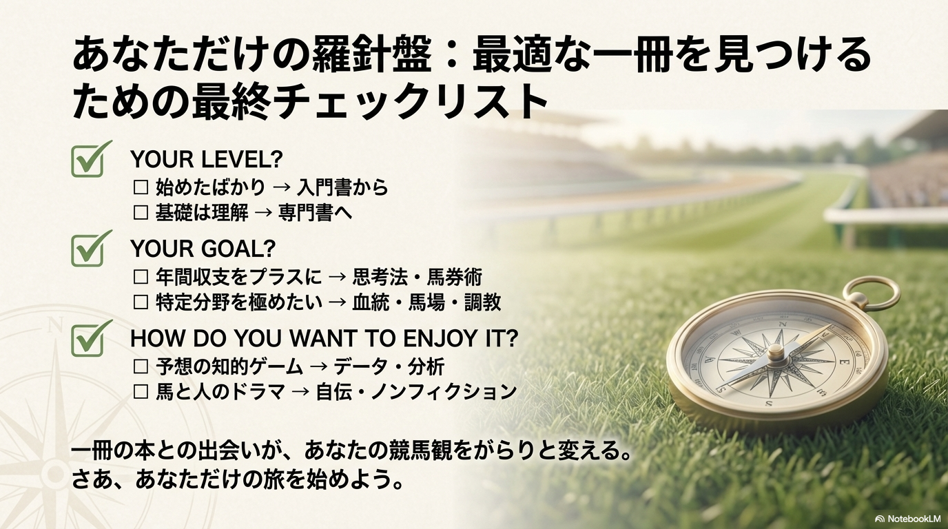 ここまで、様々な角度からおすすめの競馬本をご紹介してきましたが、いかがでしたでしょうか。競馬の世界はどこまでも奥深く、その楽しみ方を広げてくれる書籍もまた、初心者向けから専門書、読み物まで実に多岐にわたります。この記事が、その広大な本の海の中から、あなたの知的好奇心を満たし、競馬ライフをより豊かにするための一冊を見つけ出すための、確かな羅針盤となれば幸いです。