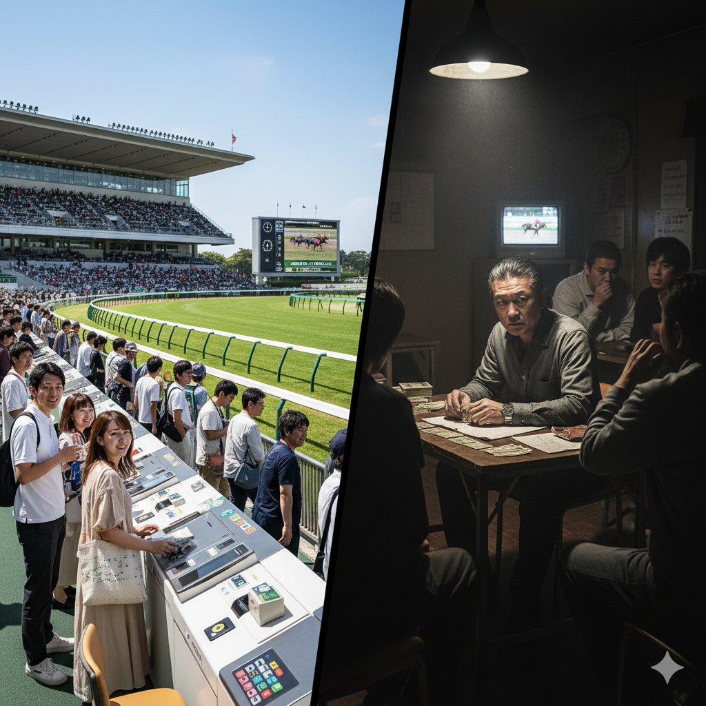 のみ行為の仕組みを理解するため、まずは身近な例で考えてみましょう。これを一言で表現するならば、「JRAや地方競馬といった正規の窓口を介さずに、個人や非合法な組織が運営する、法律で認められていない馬券屋さん」と言えます。しかし、その実態は単なる個人商店とは似て非なる、極めて危険で不透明な構造を持っているのです。その違いを明らかにするため、まずは私たちが普段利用する正規の競馬の仕組みから見ていきましょう。