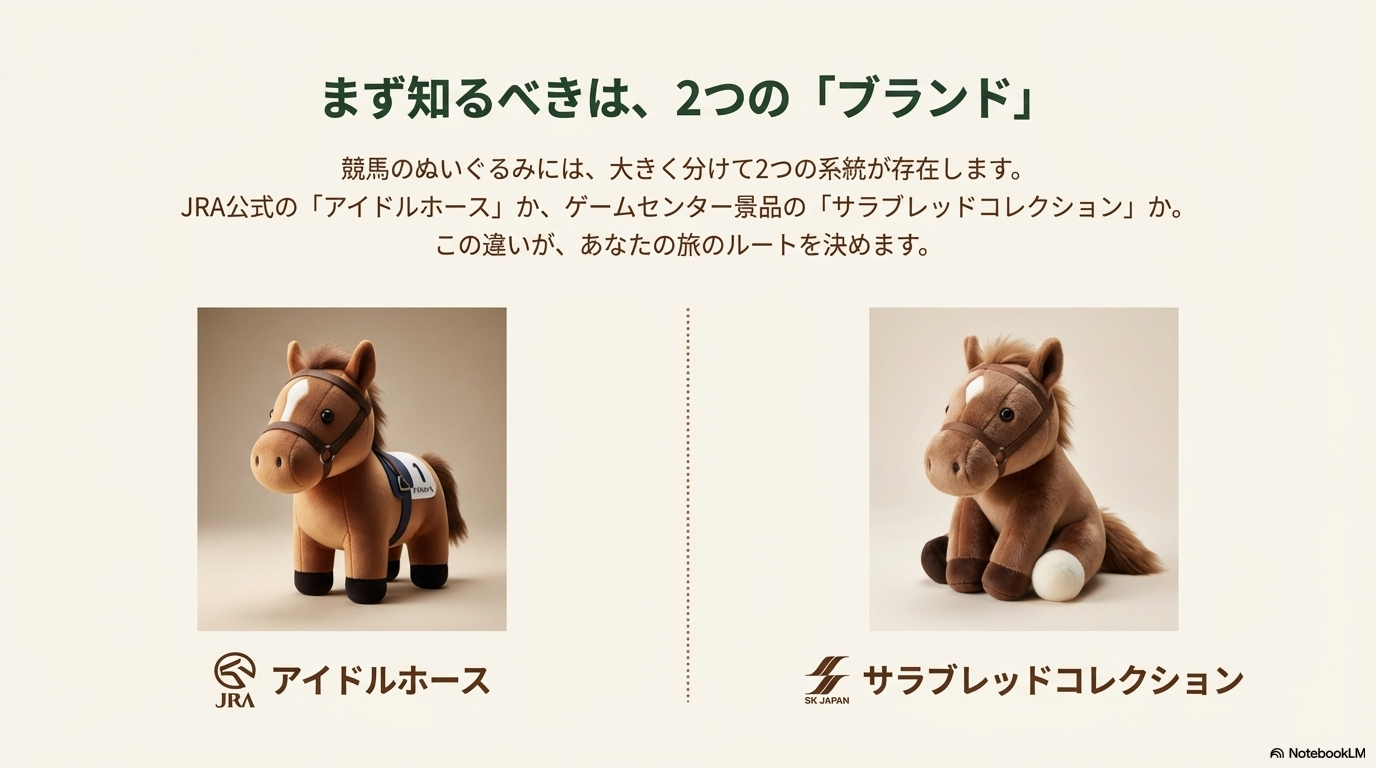 まずは、私たちが普段目にする「競馬のぬいぐるみ」には大きく分けて2つの主要なブランドラインがあることを知っておきましょう。