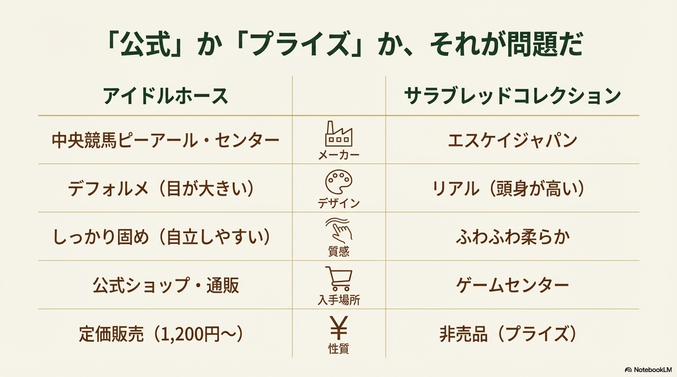 - 公式のアイドルホースとプライズのサラブレッドコレクションの違いが明確になります