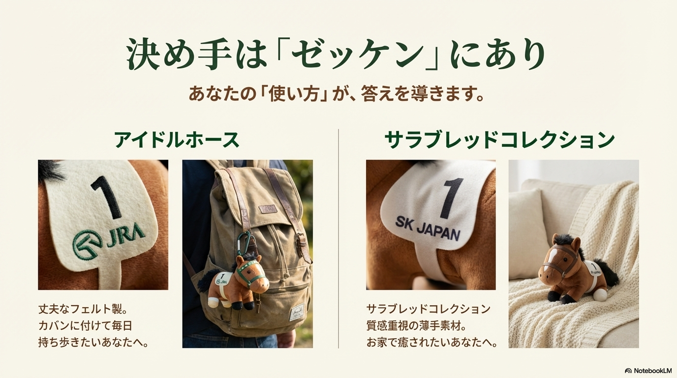 アイドルホースのゼッケンは、厚手のフェルト生地にしっかりと文字が刻まれており、非常に耐久性が高いです。一方、サラブレッドコレクションのゼッケンは、生地の質感を優先するために薄手の素材が使われていたり、プリントのみで表現されていたりすることがあります。もしあなたが「カバンに付けて毎日持ち歩きたい」なら、型崩れしにくいアイドルホースが向いているかもしれませんし、「家でゆっくり撫でて癒やされたい」ならサラブレッドコレクションが向いている、と言えるでしょう。