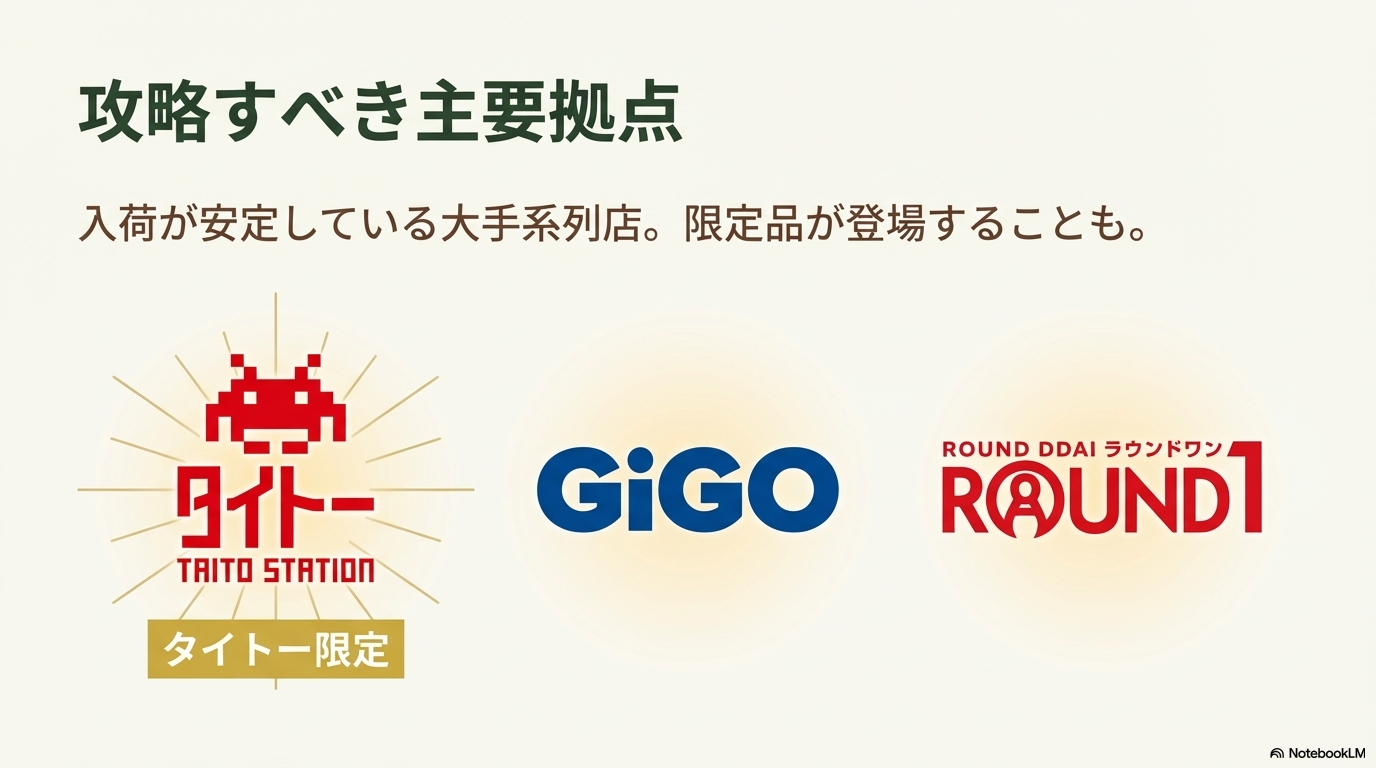 - タイトーやGiGOなど主要なゲームセンターでの入荷情報の探し方が身につきます