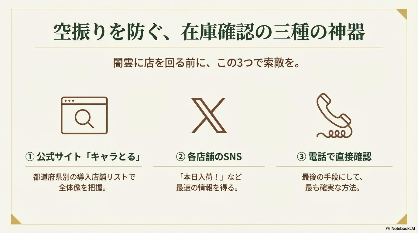 | 店舗公式SNS(Xなど) | 「入荷しました!」「完売しました!」のリアルな投稿 | 店舗に足を運ぶ直前の最終チェック |