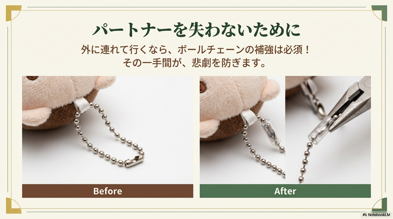 - 二重リングへの交換:一番確実なのは、ボールチェーン自体を外してしまい、頑丈な「二重リング」や「ナスカン」に付け替えることです。これなら、激しい混雑の中でも安心ですね。
