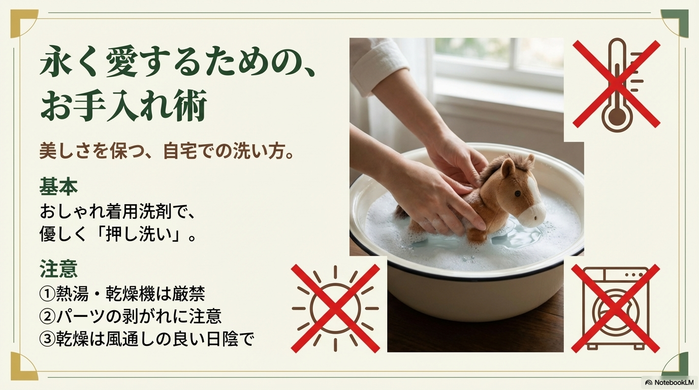 このように、手順さえ守れば自宅でも安全に洗うことができます。大切な相棒を綺麗にしてあげて、また一緒に競馬場での応援を楽しんでくださいね!ただし、非常に古いヴィンテージ品や、特殊な素材(革製品に近い合成皮革など)が使われている場合は、無理をせずプロのクリーニング店に相談することも忘れないでください。最終的な判断は、ご自身のぬいぐるみの状態を見て慎重に行ってくださいね。