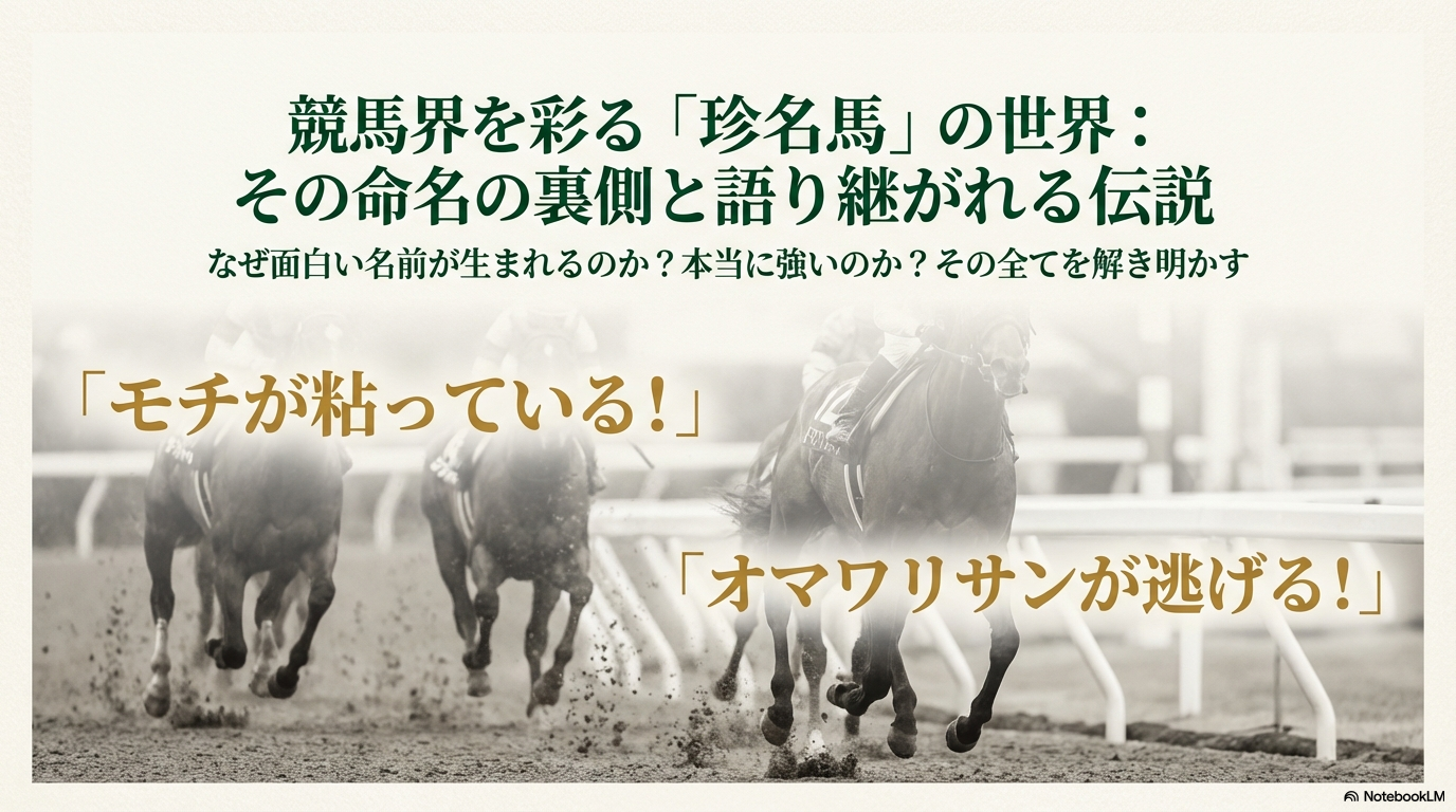 さらに、「面白い名前の馬がG1を勝った事例」を挙げながら、名前と実力の関係性にも鋭く迫ります。少し視点を変え、思わず赤面してしまうような「少し恥ずかしい馬の名前」の由来を探り、2025年現在もターフを沸かせている注目の現役珍名馬まで、その情報を網羅。定番の「かっこいい馬名ランキング」とは一味も二味も違う、奥深くも愛すべき珍名馬の世界へご案内します。この記事を読み終える頃には、あなたの競馬観戦が何倍も面白くなることをお約束します。
