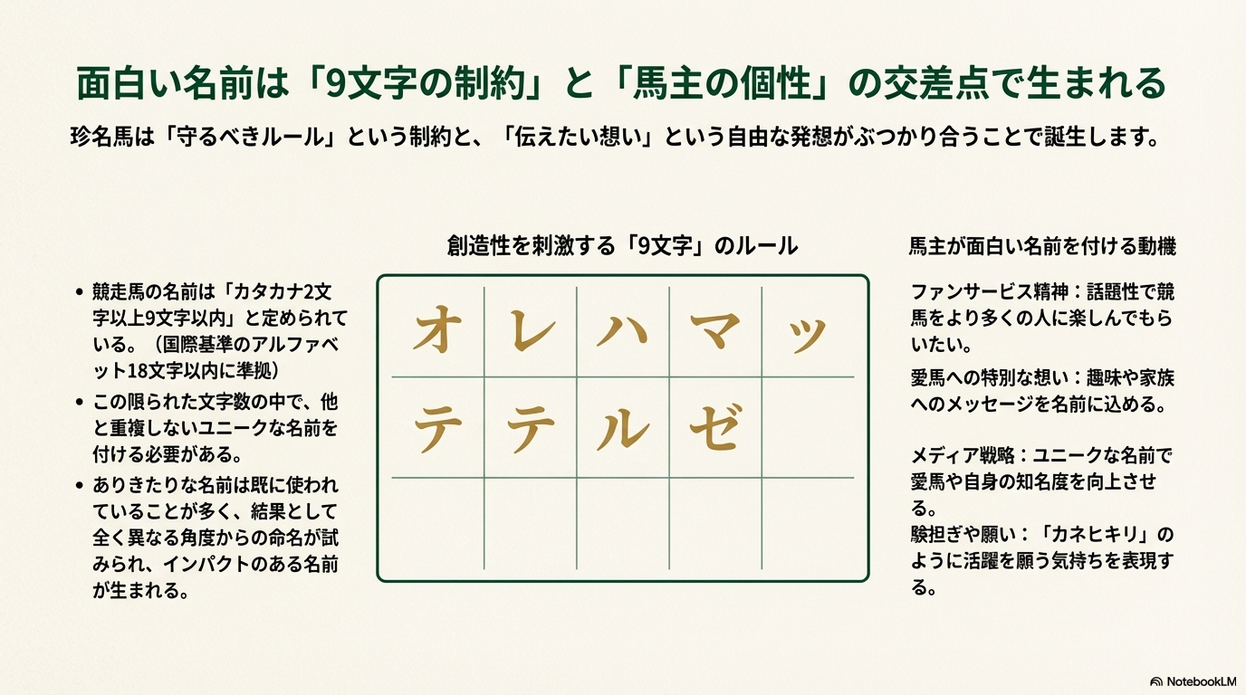 - 面白い名前は「カタカナ9文字以内」という制約の中で生まれる、馬主の創造性と遊び心の結晶であること。