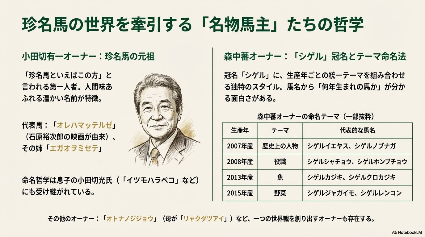 競馬界には、その卓越した命名センスで知られる「名物馬主」が存在し、彼らの所有馬はデビュー前から常にファンの注目を集めます。
