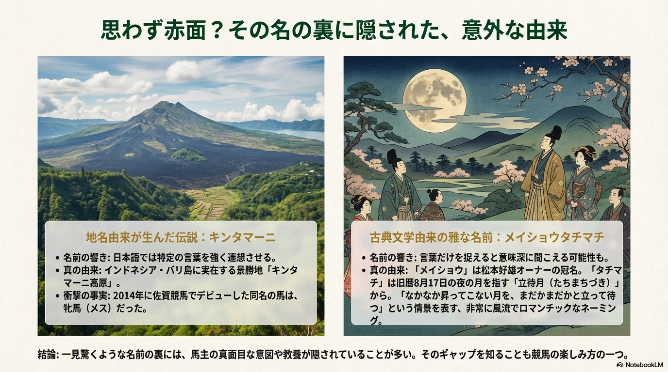 - 馬主の秀逸なネーミングセンス:全ての土台となる、面白くも示唆に富んだ馬名。