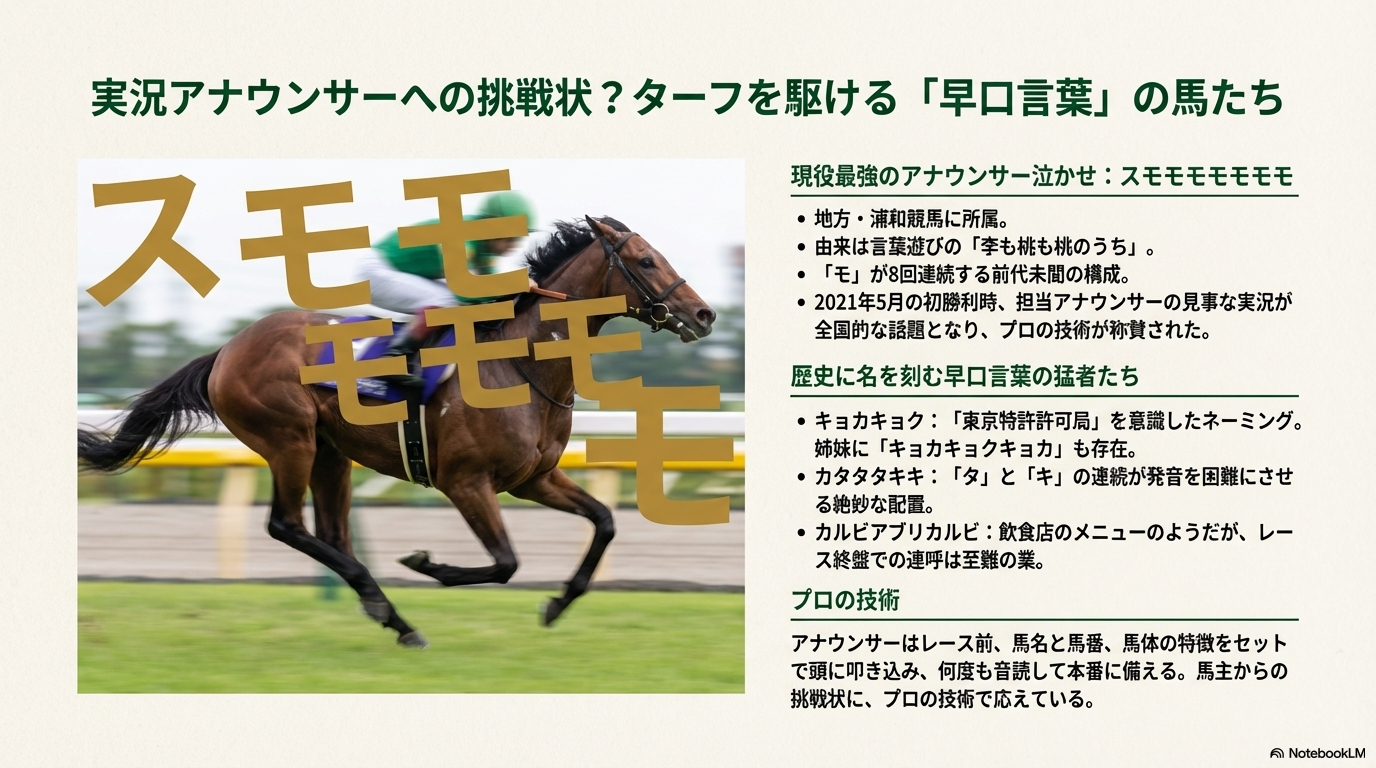 ゴール前、数万人の大観衆の興奮が最高潮に達する中、レースを伝える実況アナウンサーは、馬だけでなく自身の滑舌とも壮絶な戦いを繰り広げていることがあります。なぜなら競馬界には、まるで挑戦状を叩きつけるかのように、意図的に発音しづらく名付けられた早口言葉のような馬が存在するからです。