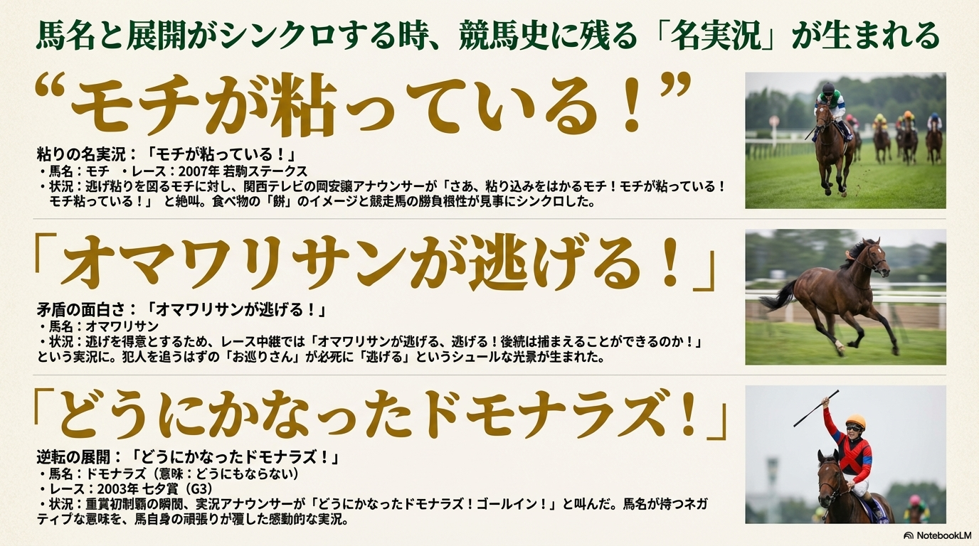 - 「モチが粘っている!」「オマワリサンが逃げる!」など、馬名とレース展開が奇跡的にシンクロした時に、競馬史に残る名実況が生まれること。