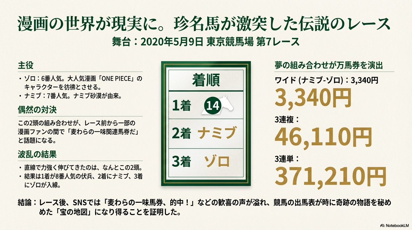 近年、最も劇的な「珍名馬対決」としてファンの記憶に刻まれているのが、2020年5月9日の東京競馬場第7レース(4歳以上1勝クラス 芝2,400m)です。このレースには、大人気漫画「ONE PIECE」のキャラクターを彷彿とさせる6番人気の「ゾロ」と、アフリカ南西部のナミブ砂漠が由来とされる7番人気の「ナミブ」が出走。この偶然の組み合わせは、レース前から一部の漫画ファンの間で「麦わらの一味に関連する馬がいるぞ!」と大きな話題になっていました。