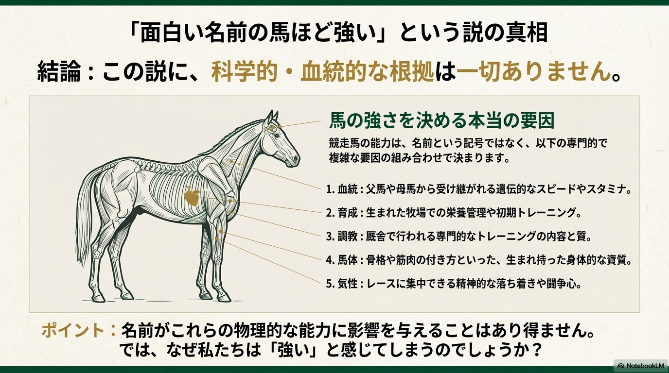 これらの要因が複雑に絡み合って一頭の競走馬のパフォーマンスは決まります。言うまでもなく、その馬に付けられた「名前」という記号が、これらの物理的な能力に影響を与えることはあり得ないのです。