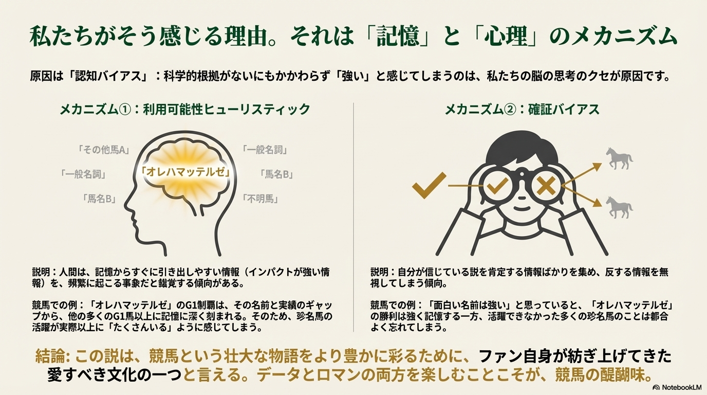 もう一つ、「確証バイアス」も影響しています。これは、自分が信じている説や仮説を肯定する情報ばかりを無意識に集め、それに反する情報を無視してしまう傾向のことです。「面白い名前は強い」と思っていると、「オレハマッテルゼ」の勝利は「やっぱりそうだ!」と強く記憶する一方で、面白い名前で活躍できなかった多くの馬や、普通の名前で活躍した大多数の馬のことは、都合よく忘れてしまいがちなのです。