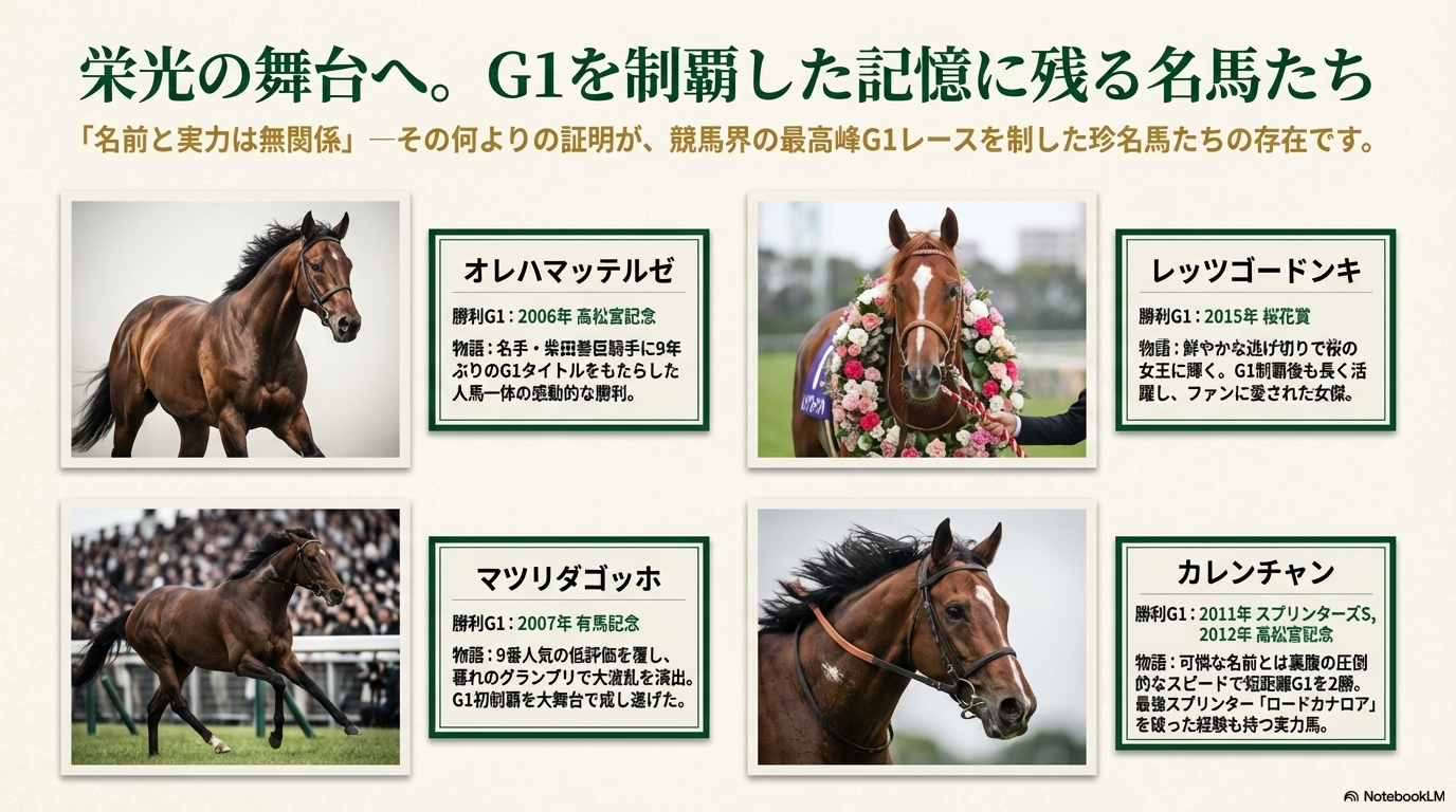 前述の通り、「名前と実力は無関係」という説を何よりも雄弁に物語るのが、競馬界の最高峰であるG1(グレードワン)レースを制覇した珍名馬たちの存在です。G1レースは、年に20数回しか行われない、まさに選ばれし者だけが立つことを許される夢の舞台。その世代のチャンピオンや、カテゴリーの頂点を決める戦いです。そんな大舞台で、ユニークな名前を持つ馬たちがエリートたちを打ち破り、栄光を掴んだ瞬間は、多くの競馬ファンに夢とロマンを与えてくれました。