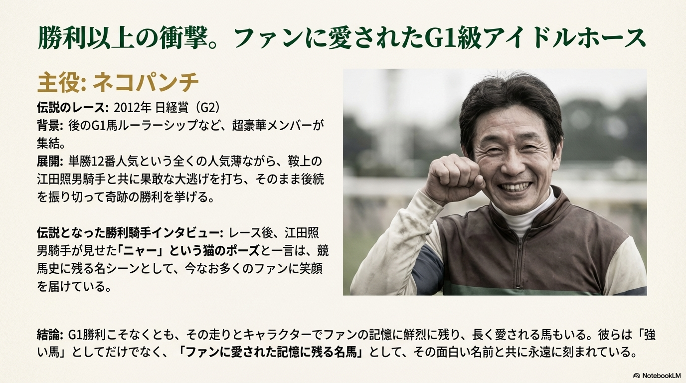 - ネコパンチのように、ファンの記憶に鮮烈に残る衝撃的な勝利を挙げ、アイドルホースとして長く愛された馬もいること。