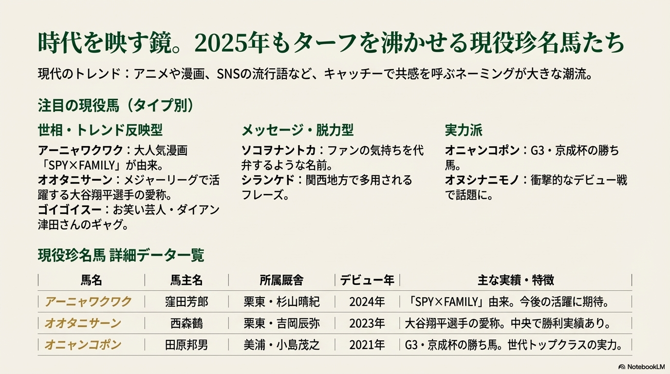 - 2025年現在も、「アーニャワクワク」など時代を映すユニークな名前の馬たちが次々と登場し、珍名馬の文化は進化し続けていること。