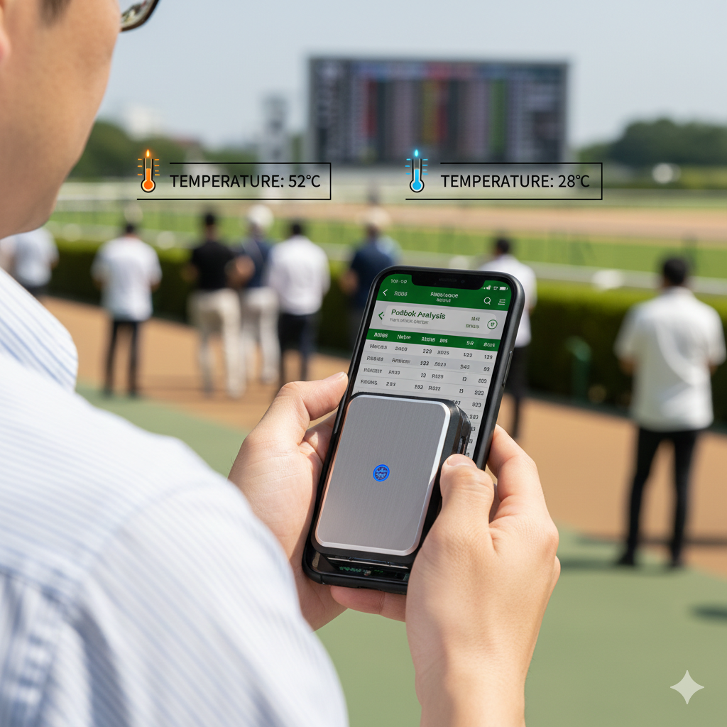 近年、日本の夏は異常な暑さですよね。小倉や新潟、福島といった夏競馬の開催地はもちろん、春の天皇賞や日本ダービーの時期でさえ、直射日光の下では気温が30度近くになることがあります。人間が熱中症対策で水分を摂るように、直射日光に晒され続けるスマートフォンにも、命を守るための「冷却」が必要です。