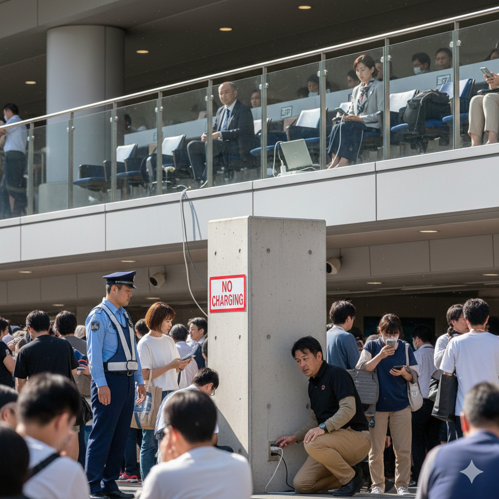 一般席や自由席エリアの柱や壁にあるコンセントは、清掃機器や業務用機器のためのものです。これらを無断で使用してスマホを充電する行為は「電気窃盗」にあたる可能性があり、警備員に厳しく注意されます。G1開催日などの混雑時は巡回も強化されているため、「ちょっとだけなら」という甘い考えは捨てましょう。