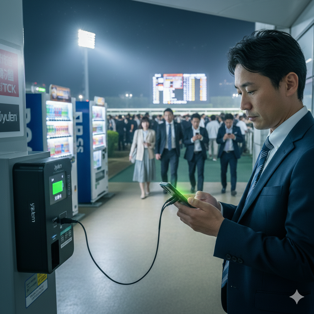 また、館内には「無料充電ステーション(ケーブルをつないでボックスに入れ、鍵をかけるタイプ)」も点在していますが、これらは数が限られている上に、充電中はスマホが手元から離れてしまいます。リアルタイムでオッズを確認したり、締め切り直前に投票したりする競馬ファンにとって、スマホが手元にない時間は致命的です。これらはあくまで「緊急用」と割り切るべきでしょう。
