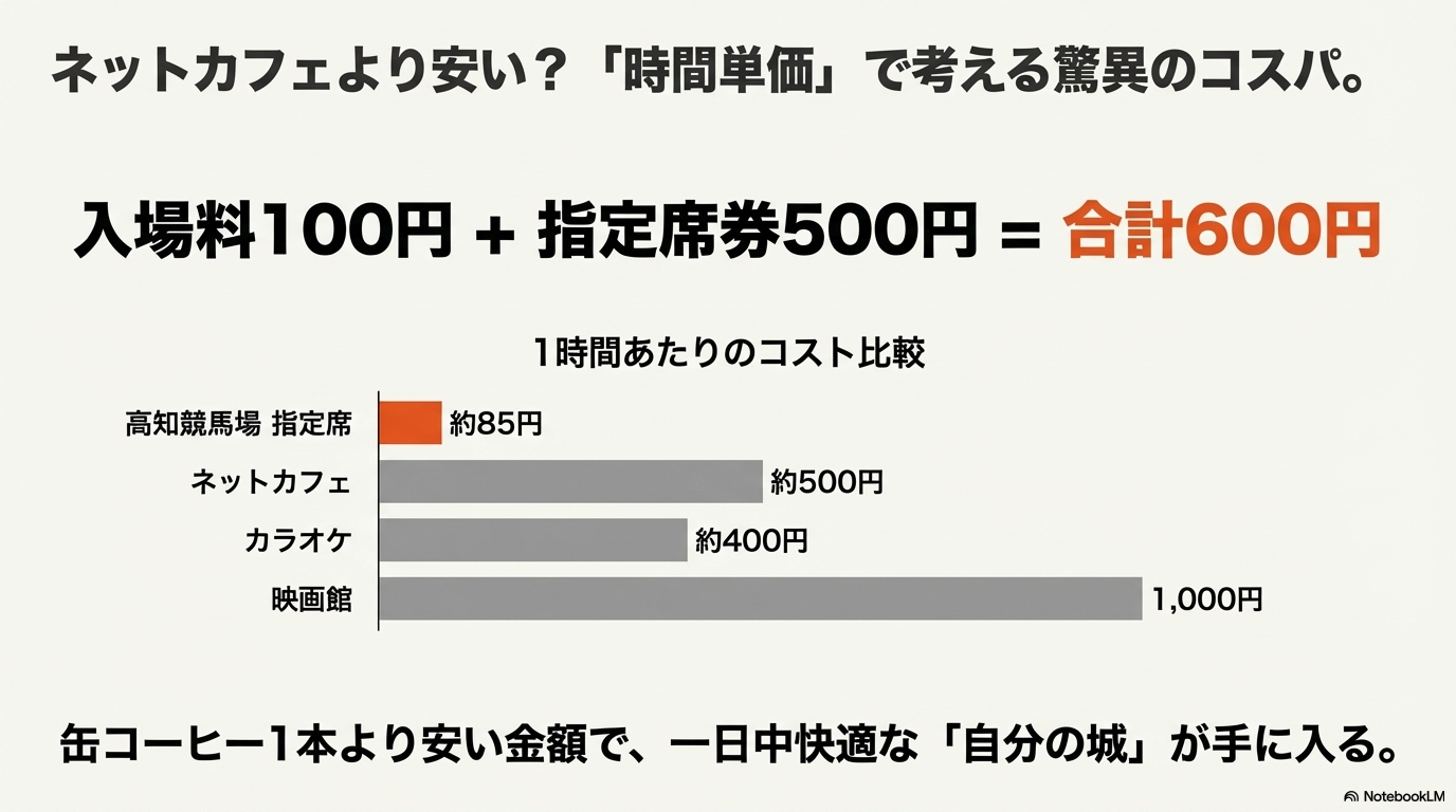 私が高知競馬場の指定席を、友人やブログ読者の皆様に強くおすすめし続けている最大の理由。それは、他のレジャー施設では考えられないほどの「圧倒的なコストパフォーマンス」にあります。