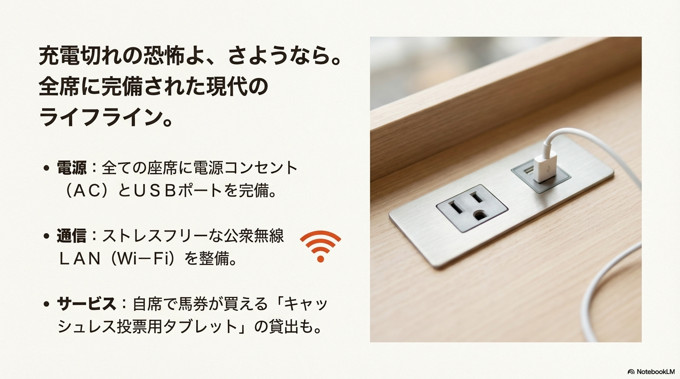 かつての地方競馬場といえば、「電源なし・Wi-Fiなし」が当たり前。モバイルバッテリーを2個持ち歩くのが常識…なんて時代もありました。しかし、安心してください。現在の高知競馬場、特にリニューアルされた4階指定席エリアは、デジタル機器を駆使する現代のファンにとって「最強の環境」へと進化を遂げています。