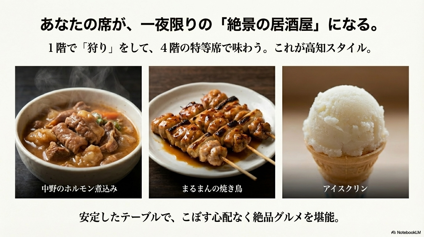 - 自由なグルメスタイル: 1階のB級グルメを持ち込むもよし、4階の食堂「馬ん軒」でオムライスを食べるもよし。食の選択肢は無限大です。