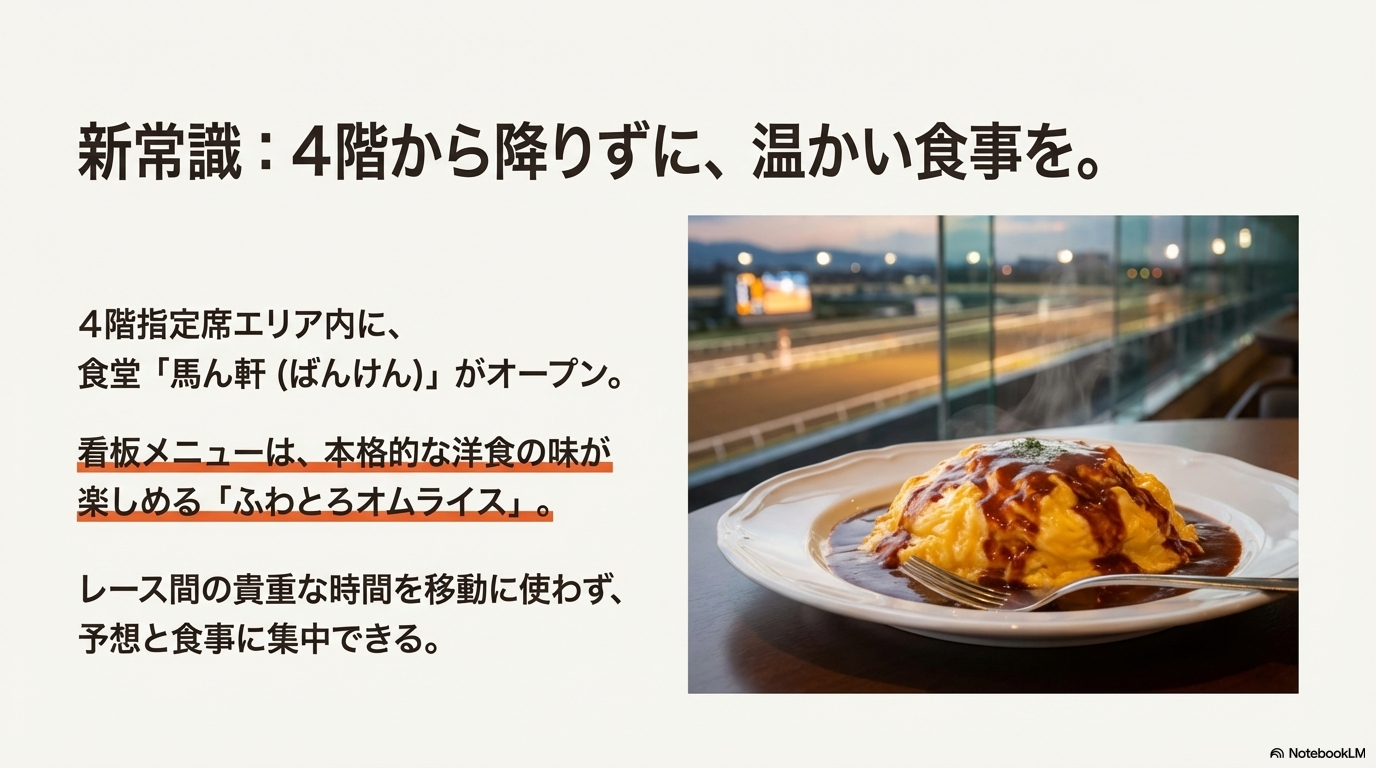 例えば、レースの予想は静かで快適な4階の自席で行い、発走直前になったらエレベーターで降りて、パドックで馬の気配を間近で観察したり、1階の売店で出来たてのホルモン焼きを買ったりする。そしてまた、誰にも取られる心配のない自分の席に戻ってゆっくりと食事を楽しむ。