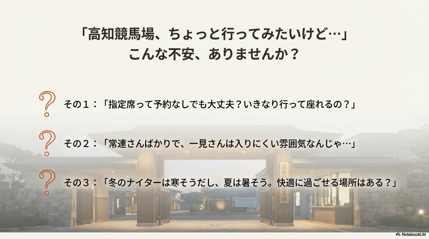 「高知競馬場の指定席って、予約なしで行っても大丈夫なの?」「常連さんばかりで敷居が高いんじゃないか…」