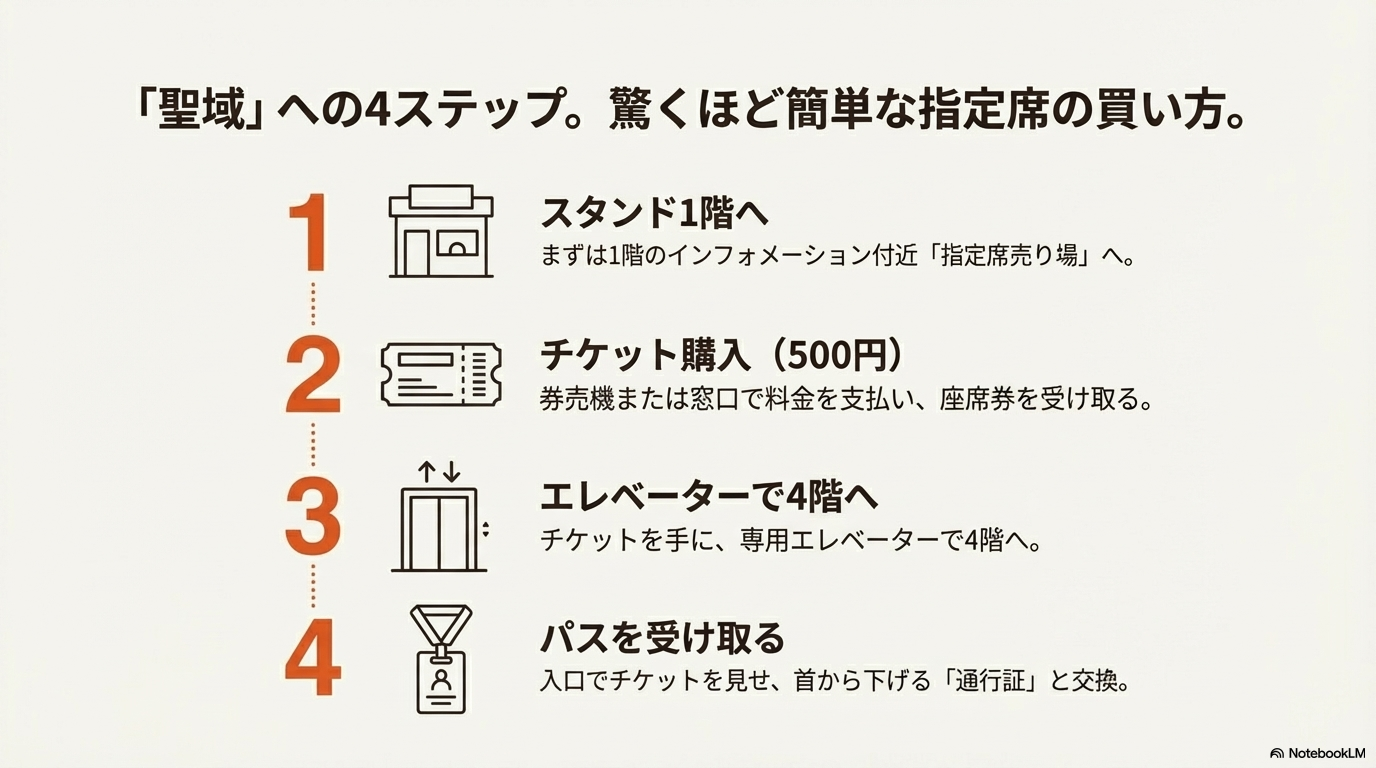 この「通行証(パス)」を手に入れることこそが、指定席購入の最大のメリットと言っても過言ではありません。このパスを首から下げている限り、あなたは4階の「聖域」と、下層階の「現場」を自由に行き来する権利を得ます。