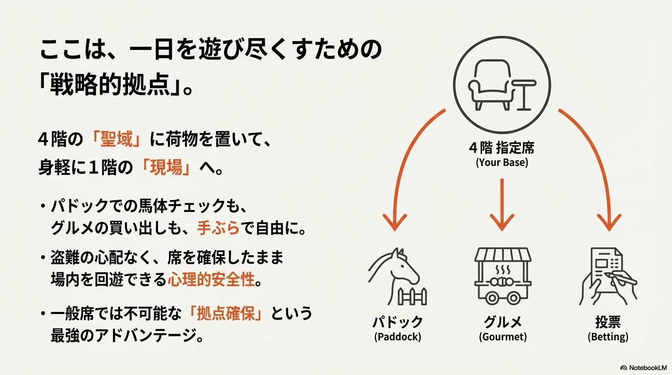 - 安心の拠点確保: 荷物を置いたまま、手ぶらで場内グルメの買い出しやパドック見学に行ける「心理的な安全性」は、金額に換算できないほどのメリットです。