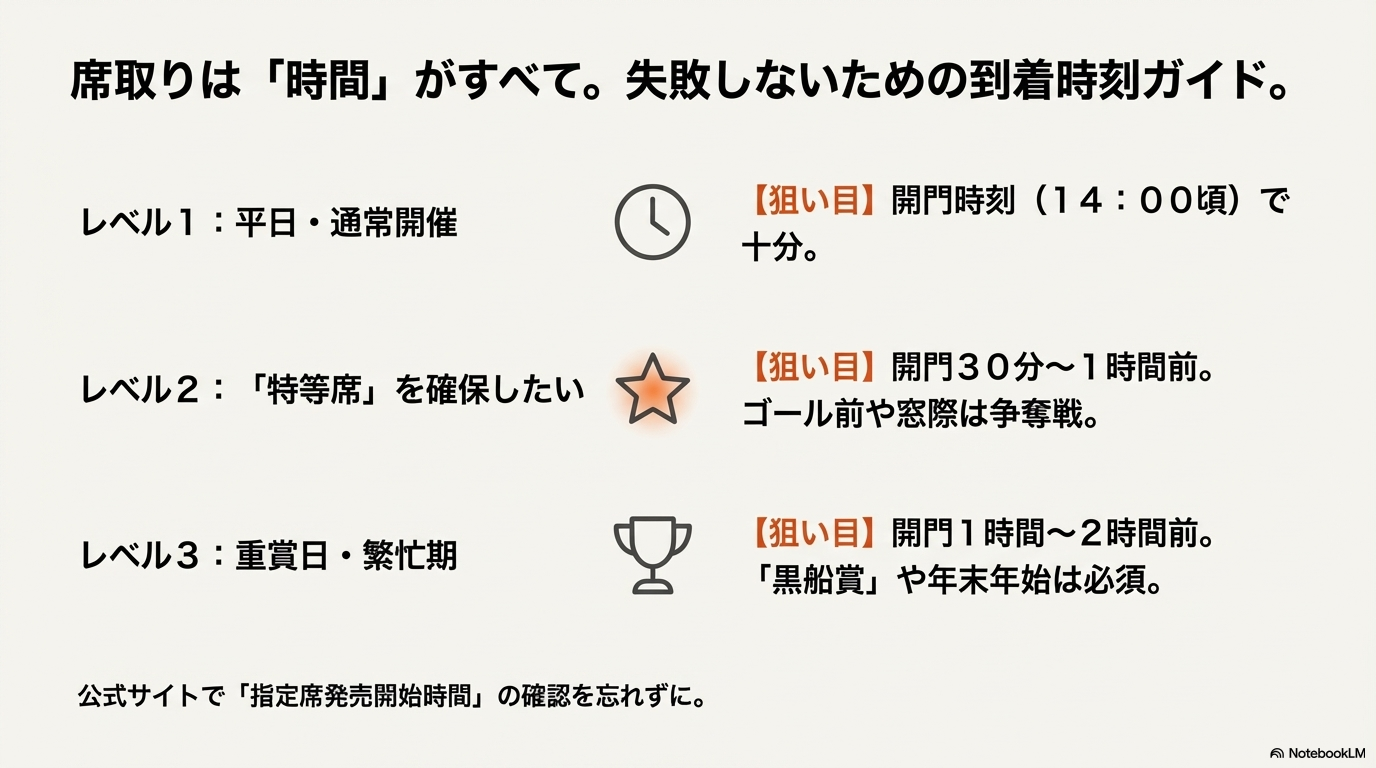 これらの「良席」は、開門と同時に埋まってしまう傾向があります。確実にキープしたいなら、開門の30分前には入場ゲート前に到着し、待機列の前の方に並んでおくのが賢明です。