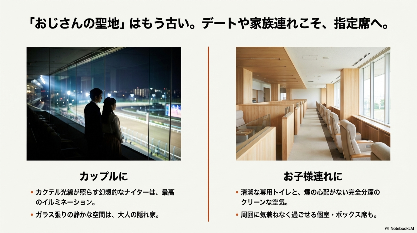 指定席を利用する上で、座席の座り心地と同じくらい、あるいはそれ以上に重要視されるのが「生理的欲求(トイレ・喫煙・休憩)」にまつわる環境です。長丁場のナイター競馬を戦い抜くためには、ストレスなくリフレッシュできるバックヤードが欠かせません。