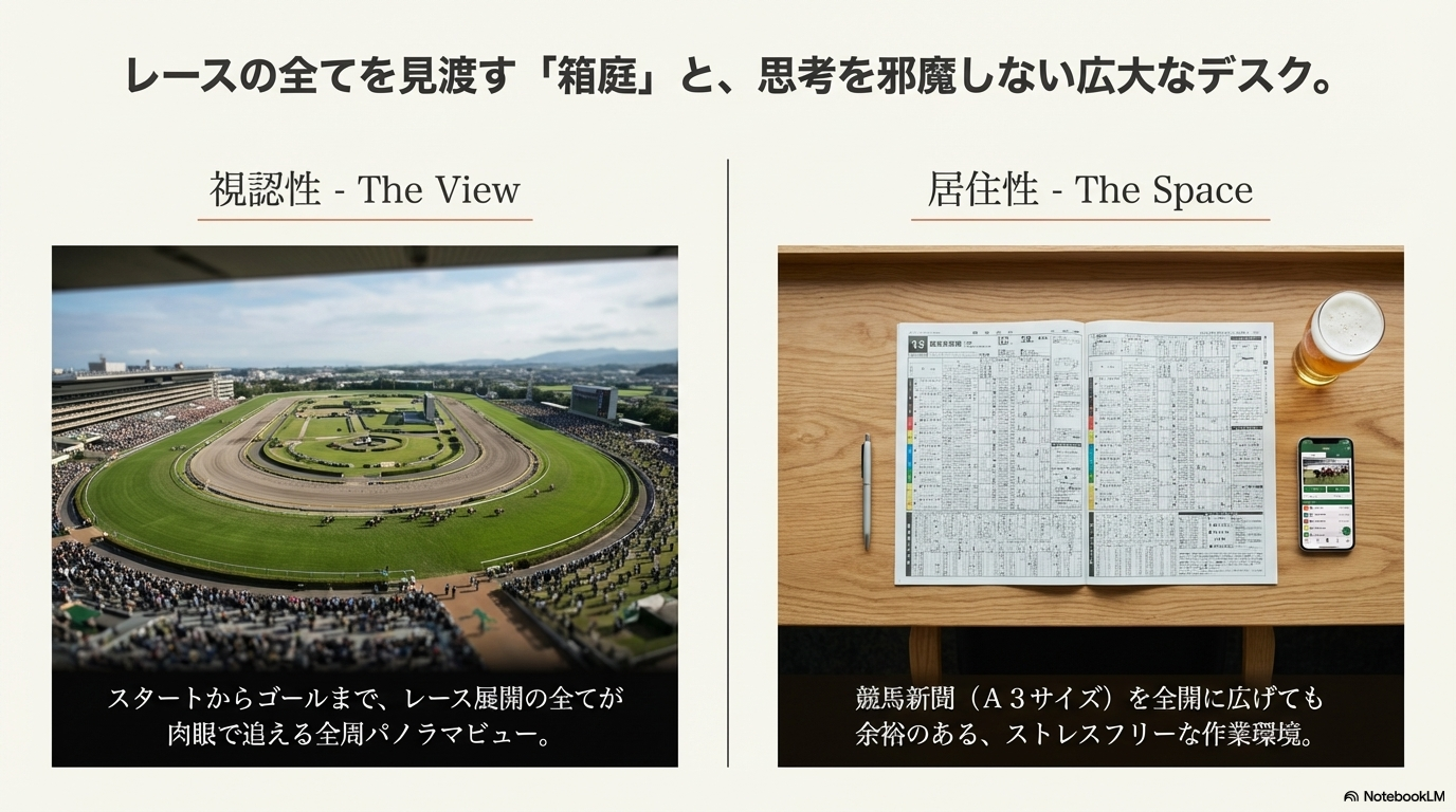 指定席を選ぶ際、私たちが最も気にするポイント。それは「レースがどう見えるか(視認性)」と「予想作業がしやすいか(居住性)」の2点に尽きるのではないでしょうか。