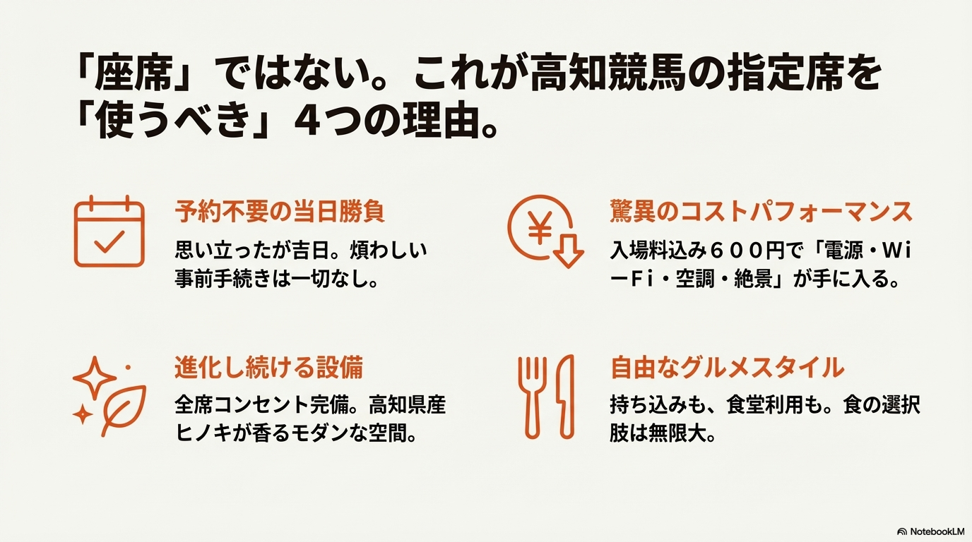 記事を最後まで読んでくださったあなたなら、もうお分かりいただけると思います。高知競馬場の指定席は、単なる「座る場所」ではありません。それは、1日を通して行われる長丁場のエンターテインメント(夜さ恋ナイター)を、疲労を最小限に抑えつつ、最大限の知的生産性と快楽を持って完遂するための「戦略的拠点(ベースキャンプ)」なのです。
