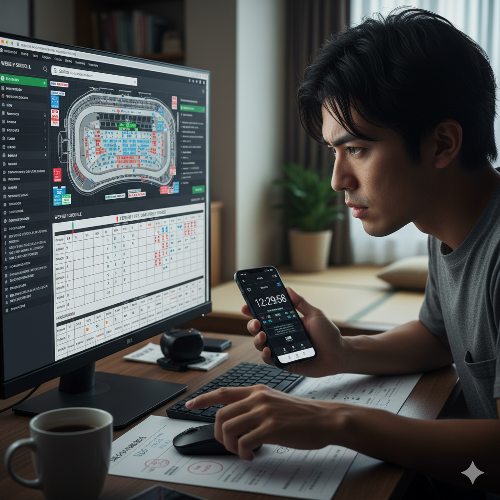 ちなみに、前のセクションでも触れましたが、システムの休止時間が「毎週水曜 11:30~12:30」、さらに抽選発売がある週は「金曜 11:30~12:30」 に設定されています。つまり、発売開始直前の12:25頃にログインして待機しておく、という作戦が使えないんです。12:30になった瞬間に、全国のファンが一斉にログインを試みるため、あの熾烈なアクセス集中が発生するわけですね…。